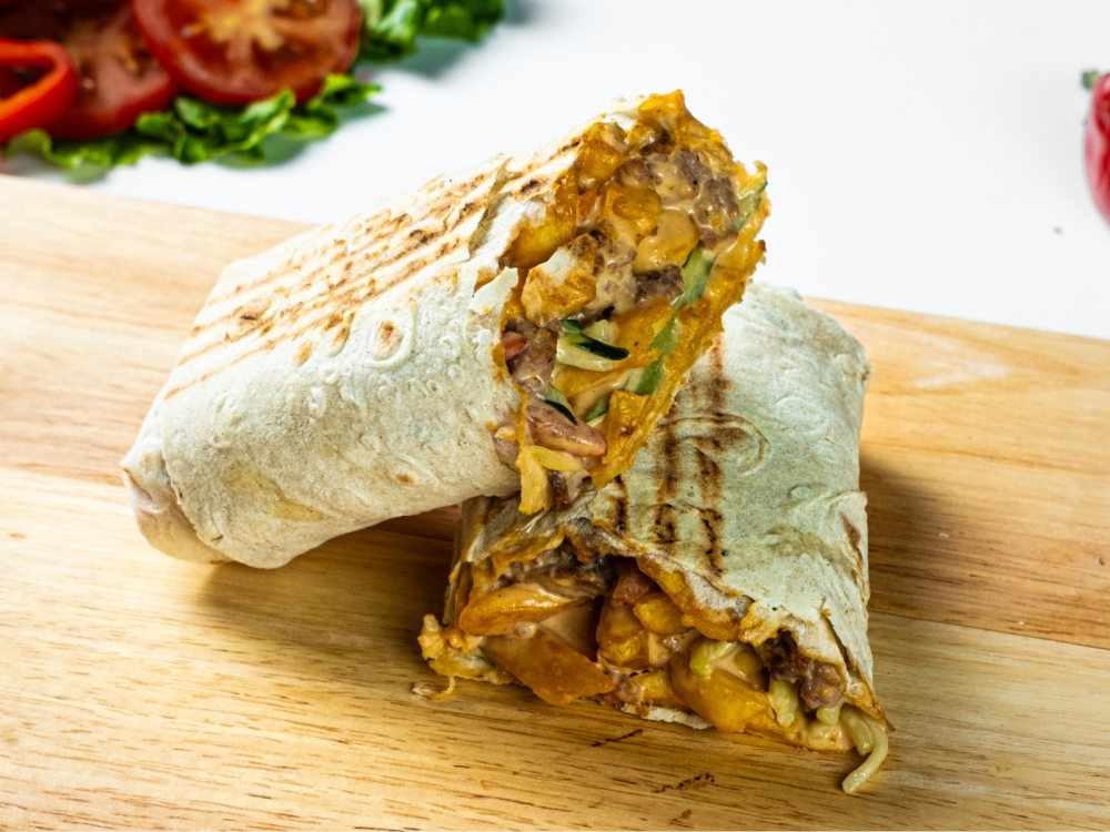 Лаваш (35 см), огурцы, помидоры, картофель фри, лист салата, люля-кебаб