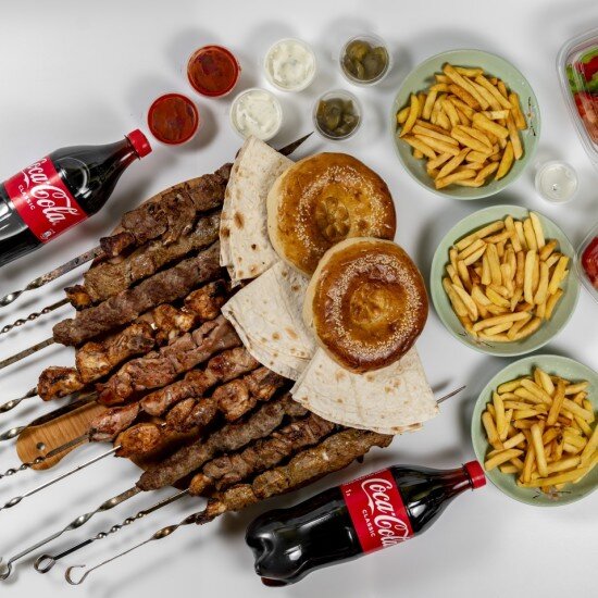 Филе индейки – 2 порции Люля-кебаб(на выбор:куриный,мясной) – 2 порции Окорочка – 2 порции Салат – 1 порция Картошка фри – 2 порции Кока-кола 1л – 1 шт Соус – 2 шт Лепешка – 1 шт Лаваш – 2 шт