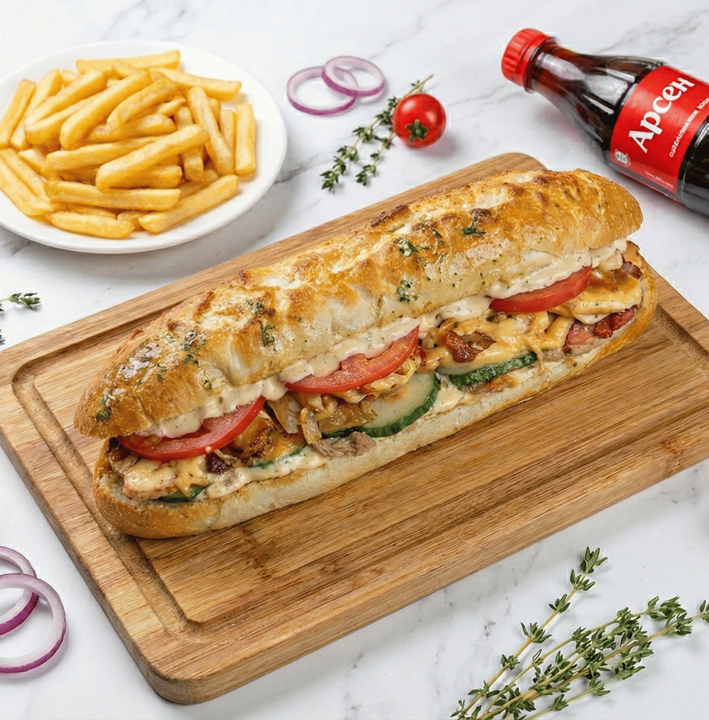 Сочное мясо на выбор в хрустящем багете, золотистый картофель фри и освежающий напиток на выборi - всё, что нужно для отличного настроения и заряда энергии. Удобно, вкусно и по-настоящему сытно