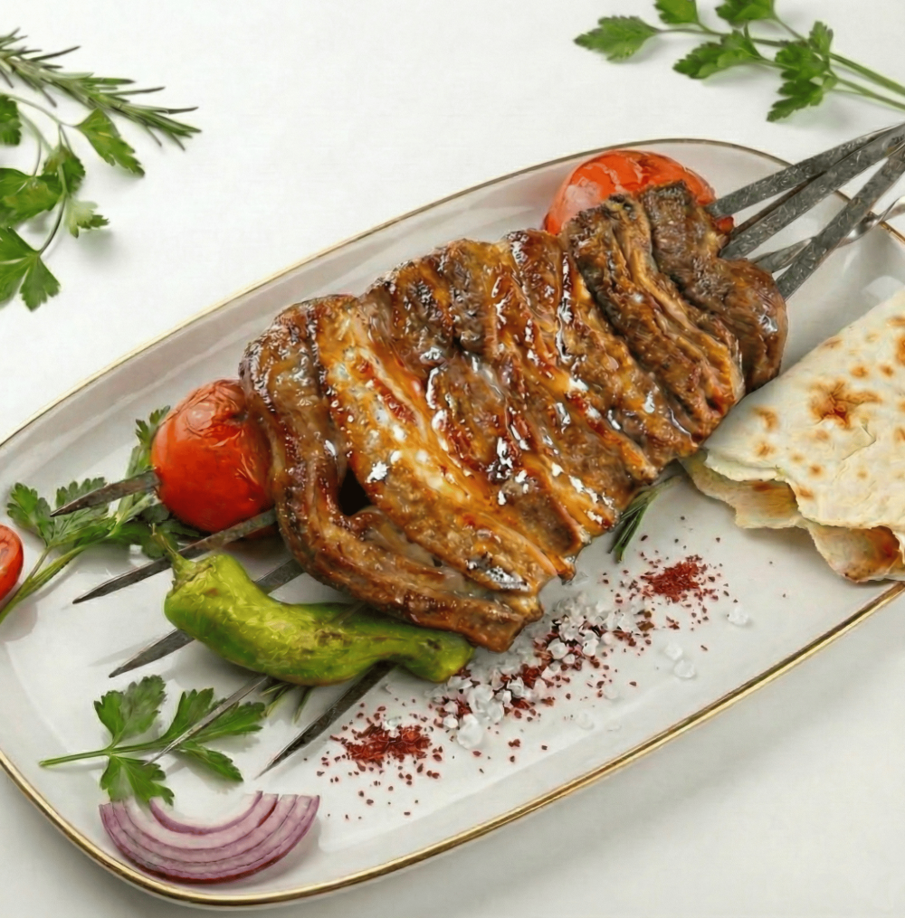Фирменный шашлык ,мякоть говядины, курдюк, специи, сладкий перец, помидор