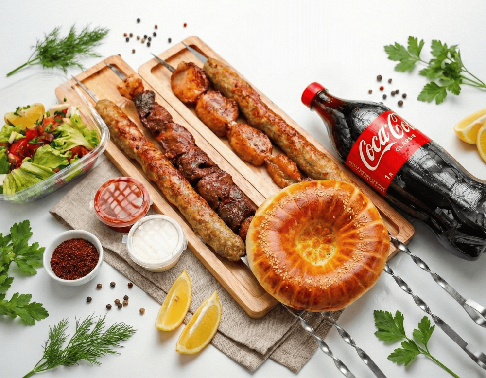 Баранина -1 порция Люля-кебаб куринный -2 порции Шашлык из утки -1 порция Лепешка -1 шт Напиток - 1л Салат - 1 порция Соус - 2 шт