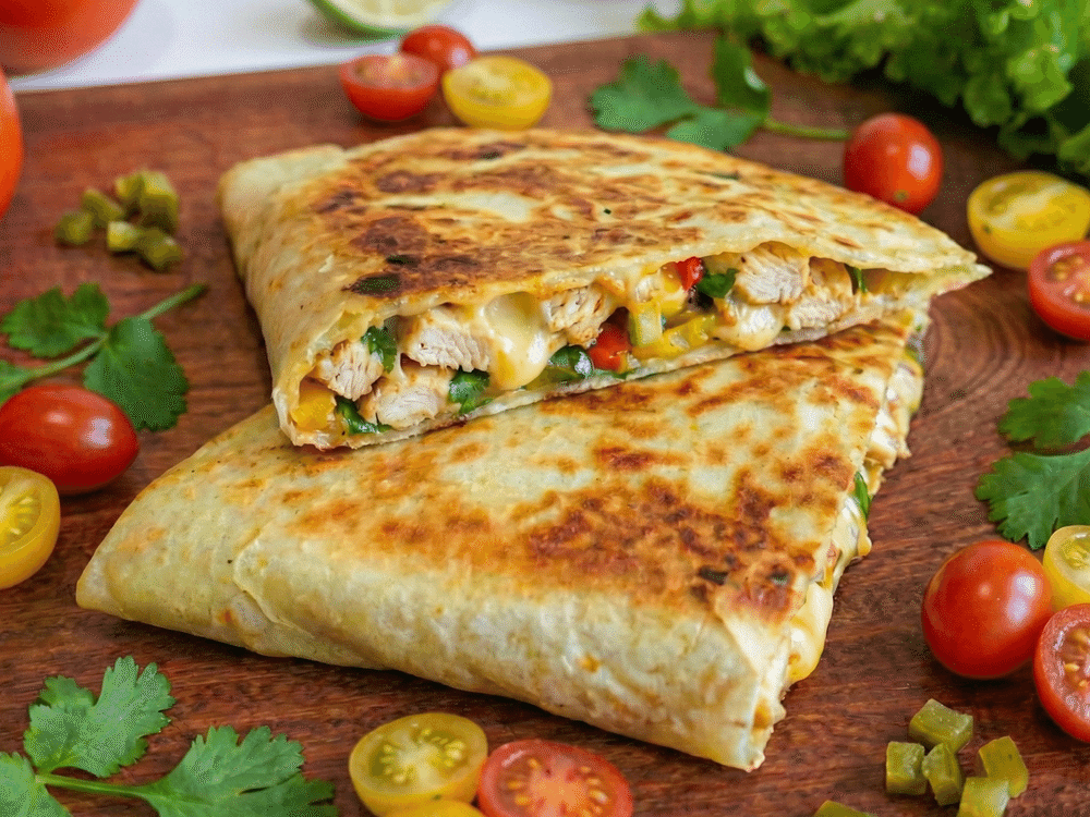 Тёплая лепёшка с тянущимся сыром и кусочками сочного куриного шашлыка, дополненная майонезом и кисло-сладким соусом