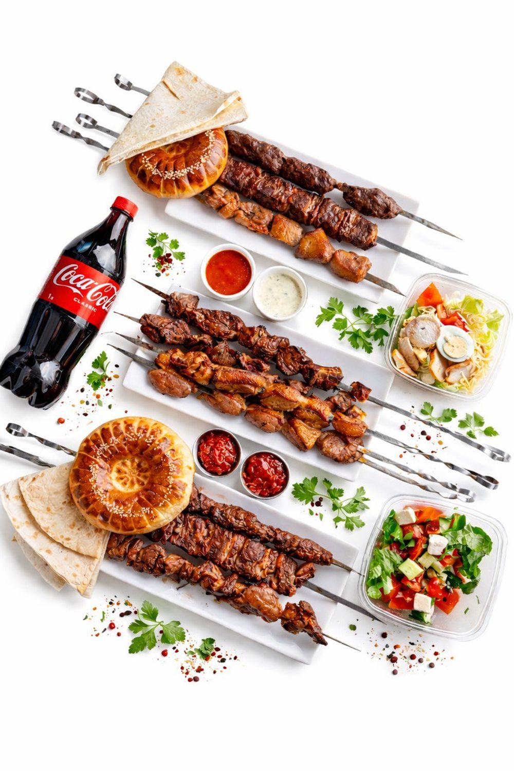 марварид - 2 порции баранина - 3 порции люля кебаб - 2 порции утка - 3 порции салат - 2 порции соус на выбор (белый или красный) - 2 шт фирменный соус - 2 шт лепешка - 2 шт лаваш -2 шт кола - 1 шт
